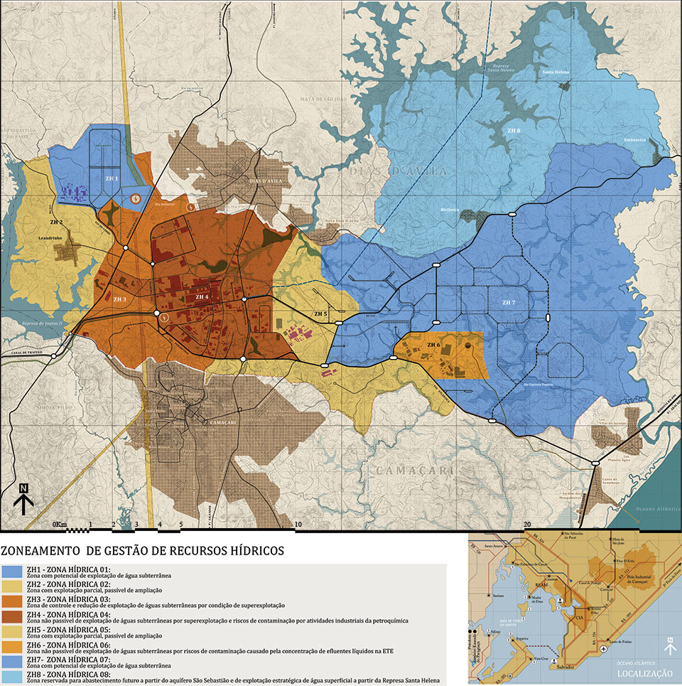 A composição da modelagem espacial também está diretamente relacionada à disponibilidade e planejamento da gestão dos recursos hídricos, necessário ao desenvolvimento sustentável do Polo Industrial de Camaçari. Da mesma forma que o aquifero São Sebastião foi determinante para a decisão locacional do Copec, ele representa hoje um recurso importante para a manutenção e desenvolvimento de diversas tipologias industriais. Além disso, o desbalanceamento hídrico provocado pela superexplotação de águas subterrâneas em algumas áreas do Polo, que causaram inclusive riscos de contaminação do lençol, remonta a necessidade de incorporar no plano de acondicionamento territorial o Zoneamento de Gestão de Recursos Hídricos Subterrâneos, que assim está definido: